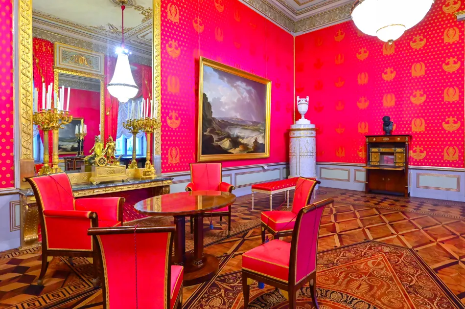 這對夫婦原本在布魯塞爾生活,法國大革命爆發後搬回來,有些物件價值連城,工人得小心翼翼的拆卸、搬運。通過壁爐室會來到粉紅房間,名字是來自牆面顏色,也有懸掛 Albert Casimir 的肖像。粉紅色房間用途多變,曾經是臥房,最後的用途是充當吸菸室,還有拆掉牆上的裝飾(因為容易吸附異味)。