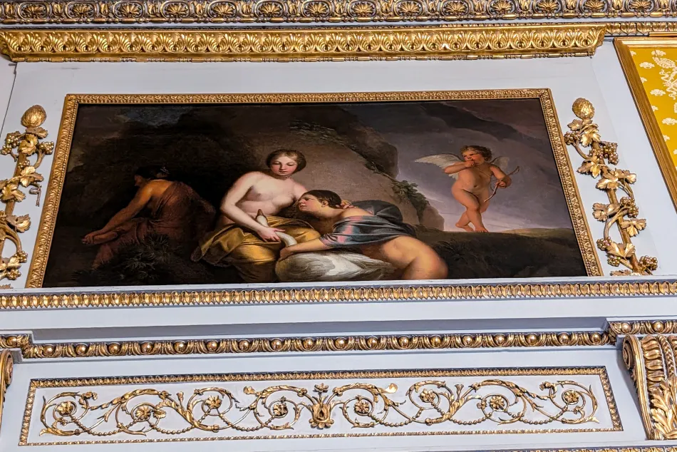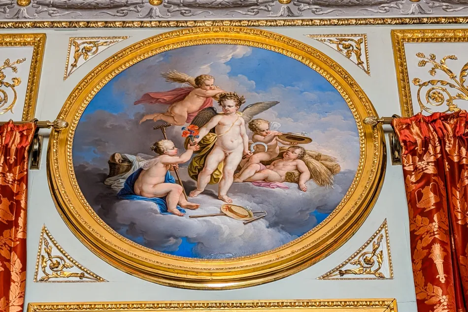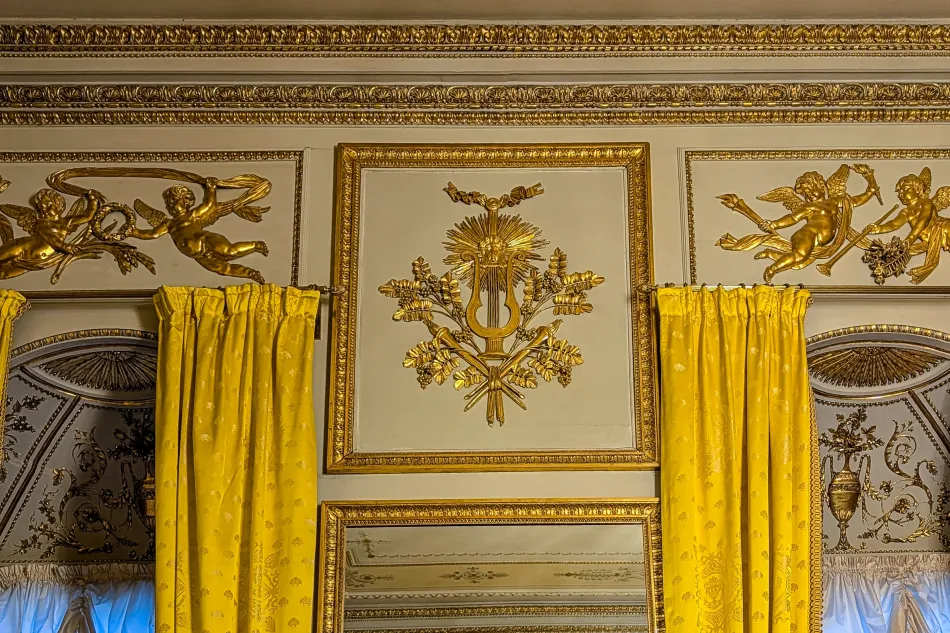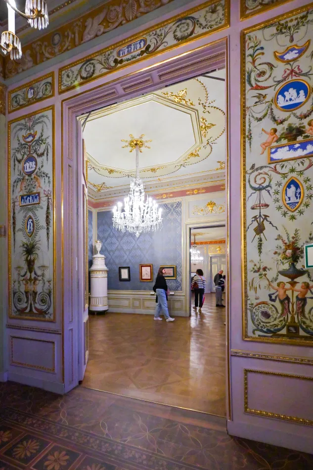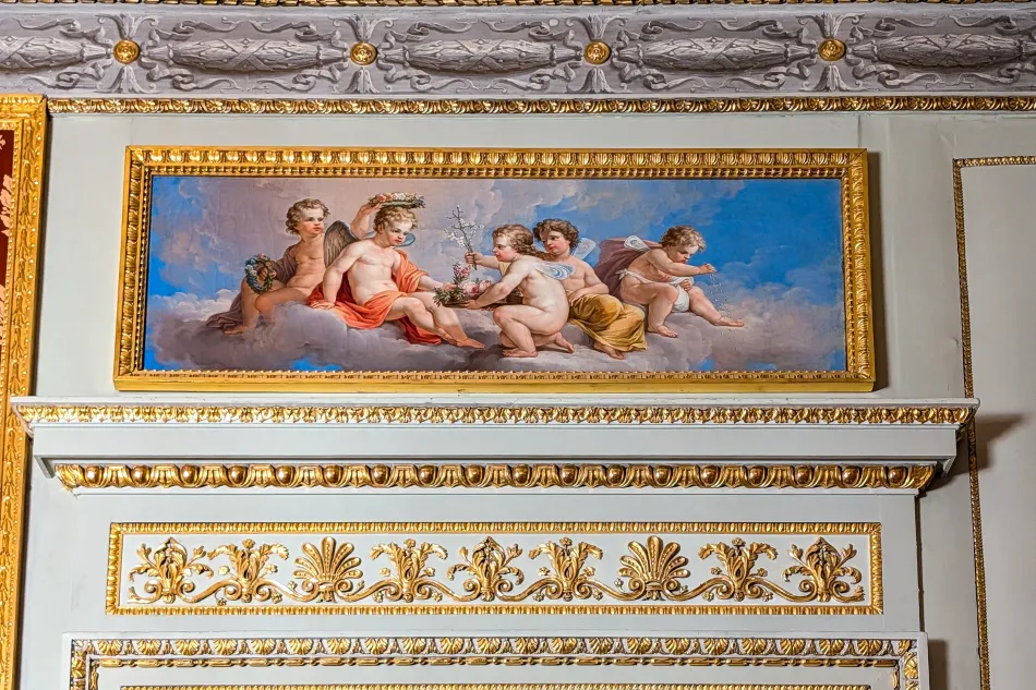 黃色房間是娛樂用的房間,風格比較隨興、放鬆,反映在門上的神話故事,而當時的年輕貴族也需要有解讀這些神話故事的能力,導覽內容也有簡介 Albert Casimir 跟 Maria Christina 到義大利壯遊的過程。這間其實蠻特別的,牆上有懸掛一幅拉斐爾的《草地聖母》複製畫,原畫為維也納藝術史博物館重要展品(相關遊記)。