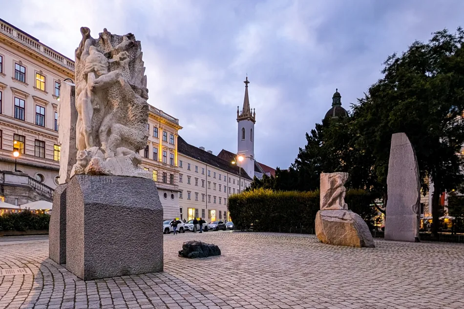 阿爾貝蒂娜博物館旁邊的廣場 Helmut-Zilk-Platz 有一個紀念碑:Mahnmal gegen Krieg und Faschismus(Monument Against War and Fascism,反戰與反法西斯紀念碑),紀念的對象是所有奧地利在二戰期間受法西斯(就是納粹政權)迫害的人,不僅限於猶太人,揹著荊棘、趴在地上的雕像則是象徵猶太人。