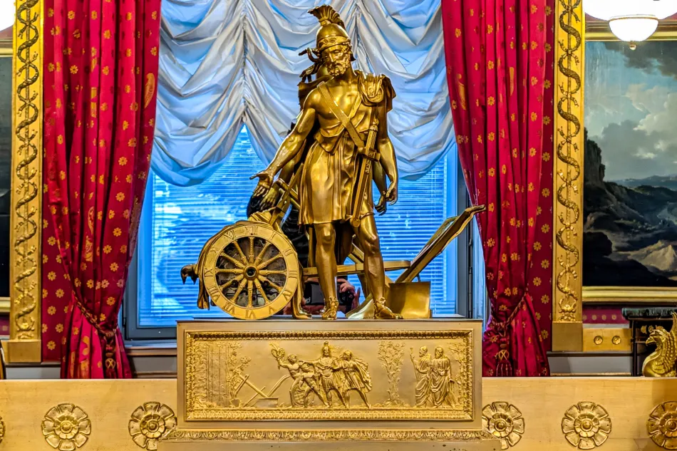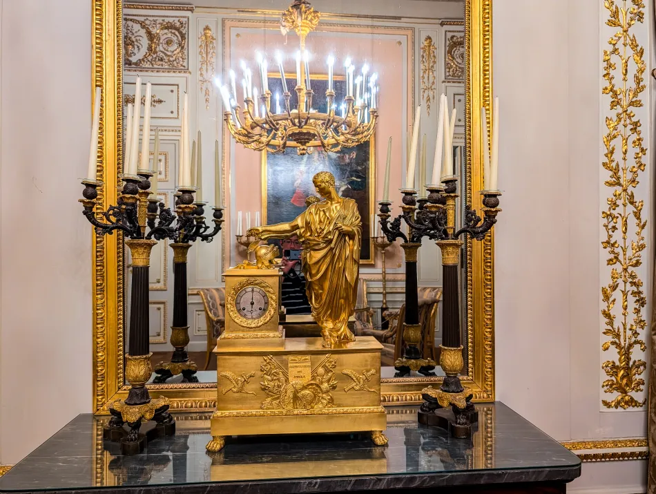 進入之後搭配導覽內容就可以很輕鬆地參觀,展廳才21間,動線很簡單、也不會花太多時間,我就不逐間介紹了。通過前廳之後會來到壁爐室,這區域乍看之下有很多金箔,但大都是很薄的黃銅。這邊的壁爐在當時很先進,加熱系統位於別處,經由壁爐將暖空氣送到這邊。