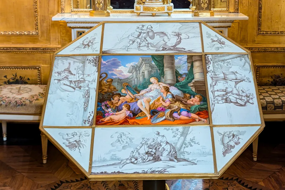 這區域有一個金碧輝煌的小隔間,擺放了一張很特殊的桌子,那是這張桌子是瑪麗.安東妮皇后(路易十六的老婆)送給妹妹 Maria Christina 的禮物,由法國王室御用瓷器廠塞夫爾(Sèvres)製造的。