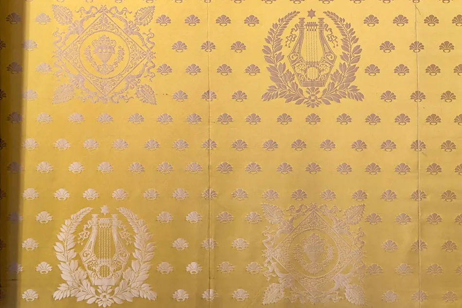 皇家書房與金櫃室是超特別的區域,皇家書房的壁紙是所謂的「里昂藍」,為法國王室愛用顏色,Albert Casimir 需要請里昂廠商製作,而卡爾大公就…利用間諜活動探知生產方式,最後在維也納生產。