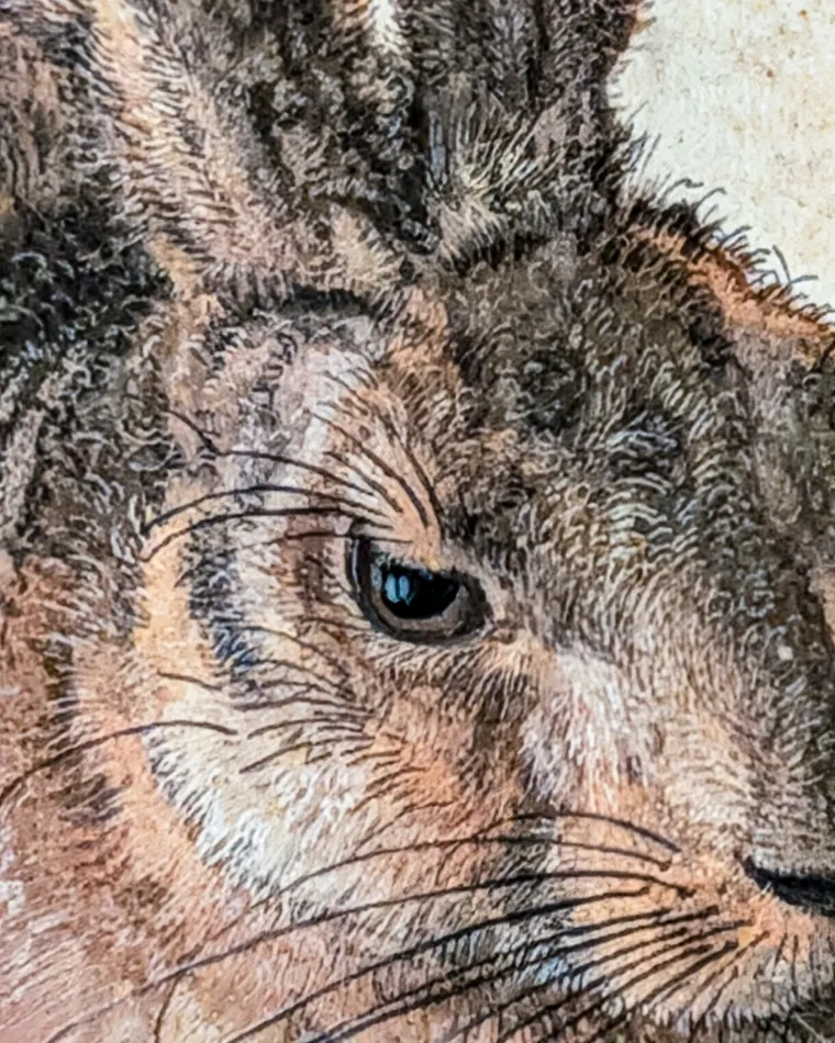 這些素描、版畫最有名的是,最知名的為杜勒的《Feldhase》(野兔),用栩栩如生來形容也不為過,仔細觀察眼睛還可以發現反光,紐倫堡的杜勒之家外面有一個這兔子的雕刻(相關遊記)。