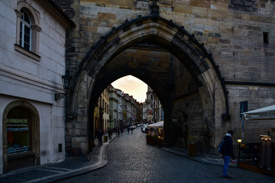 小城區橋塔的外觀蠻特別的,通過之後就是通往布拉格城堡必經的小城區。這個橋塔由兩座塔樓組成,矮的那座的年代比較久遠,高的那座也可以付費參觀,目前的外觀可以追溯到16世紀末。鄰近橋塔的區域有階梯可以下到兩側的河岸,不用走到過了橋塔之後再繞路。