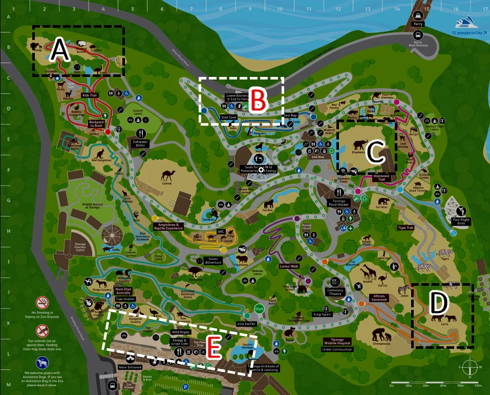 - 如果純欣賞動物、沒要看表演,建議由 Main Entrance 入園後先將目標設定為 Wombat Burrow,結束這一段的行程後再視剩餘時間將目的地設為大象區(比較近)或獅子區(比較遠),最後由 Lower Entrance 離開、搭乘渡輪回到環形碼頭