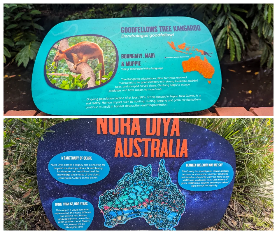 既然到了澳洲最大的動物園,重點當然就是澳洲原生動物,共有 Kangaroo County(Buru Nura)、Koala County(Gulamany Nura)、Dingo County(Wuragal Nura)、Wombat Burrow 等等,對應了袋鼠、無尾熊、澳洲野狗、袋熊等等動物的活動區域。