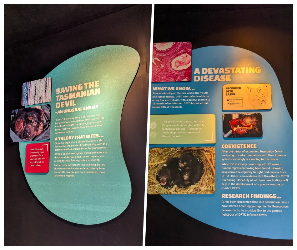 袋獾特區讓我印象超深刻,除了介紹這動物的習性,還有詳細說明牠們因為袋獾面部腫瘤病而遭遇的生存危機,這種會傳染的疾病可以想成是袋獾間的癌症,因為袋獾重要的社交習性(撕咬、碰觸臉部)導致難以預防疾病的感染,患上這疾病袋獾臉部會變得超級可怕。