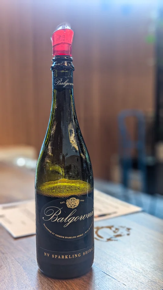 抵達的時候離中午還有一點點時間,就先品酒,這邊的品酒也是讓我印象深刻…因為有一支 NV Sparkling Shiraz。這個氣泡紅酒非常甜、非常順口,幾乎感受不到我不甚喜歡的單寧味(Tannin),算是兩個澳洲酒莊一日遊中喝到的第二名,但是…酒精濃度是14%。