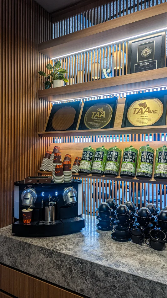 吃完之後就可以四處走走逛逛拍拍,由內部陳設就可以感受到它並不是一般的葡萄酒莊園,不管是吧檯或者酒櫃區都融合了現代感又帶點溫暖,還提供免費的咖啡,算是小小加分。