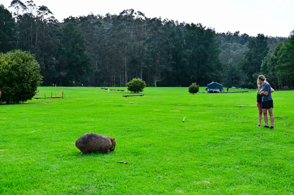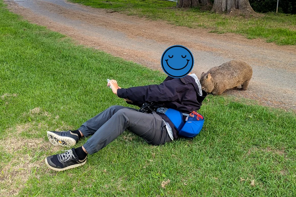 只要時間點對,袋熊在這個營地算是隨處可見,再加上這一天下午下了幾陣雨,導遊說這樣會讓天氣比較清爽,袋熊會更為放鬆。看到第一隻袋熊時除了快門按不停,導遊也會幫忙拍照,我覺得拍得算是蠻不錯的,雖然距離約1公尺,但能以長焦段營造壓縮感,讓人有超靠近袋熊的錯覺。