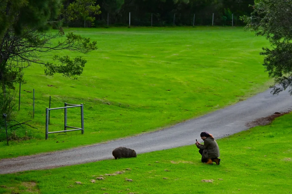 在上面的地點拍夠之後,導遊就會引領大家去袋鼠聚集的地方,當然也可以自己行動,只要準時回到車上就好。讓我印象最深刻的不是吃草的袋熊,而是看到一隻袋熊物盡其用、以各種姿勢利用圍籬來搔癢,真的是讓人…大開眼界!當然…也可以嘗試跟袋熊自拍,但難度蠻高的,因為牠眼中只有草,才不會搭理想跟牠拍照的人。
