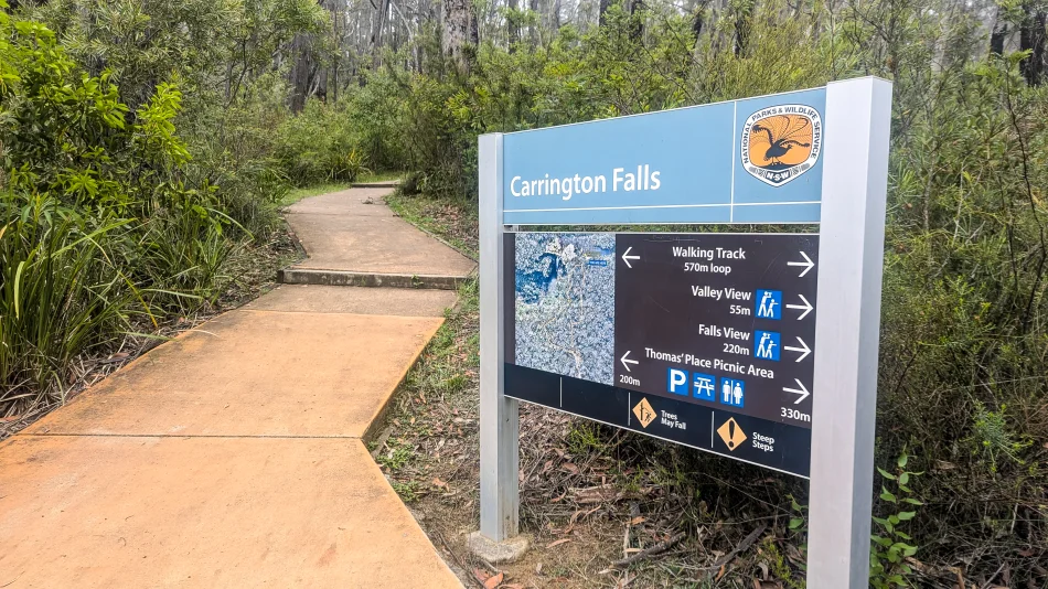 位於 Budderoo National Park 的 Carrington Falls(Google Map 位置圖)是這個雪梨野生動物一日遊的第一站,中午12點由雪梨出發後,到這邊已經約莫三點了!Budderoo National Park 佔地蠻大的,我們只造訪落差約160公尺的 Carrington Falls。