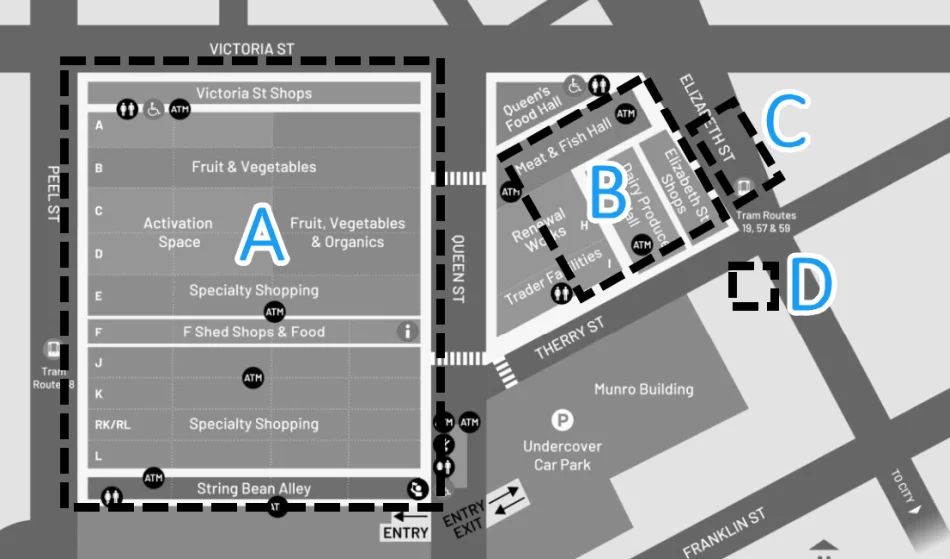 通常到維多利亞女王市場都是由 Elizabeth Street 搭乘路面電車到 Queen Victoria Market 這一站(下圖的 C),這一站還在免費路面電車區內,再過去就要付錢了!