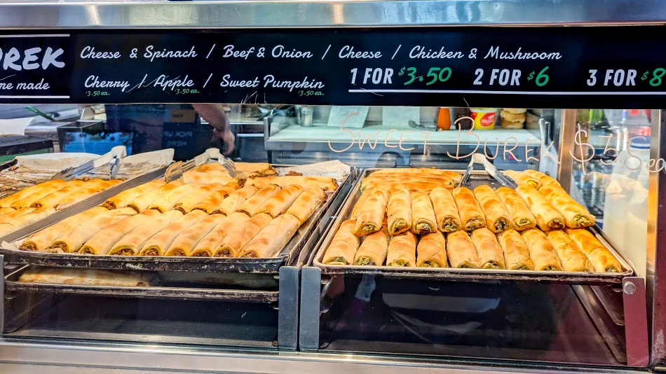 這附近還有一家店是賣肉捲,雖然稱不上美味但價格蠻便宜的,算是充飢的好選擇,口味也算豐富,也是我過去常吃的食物。想到這邊吃早餐也可以,有不少麵包店供選擇,買了之後可以在市場外的座位休息、用餐。