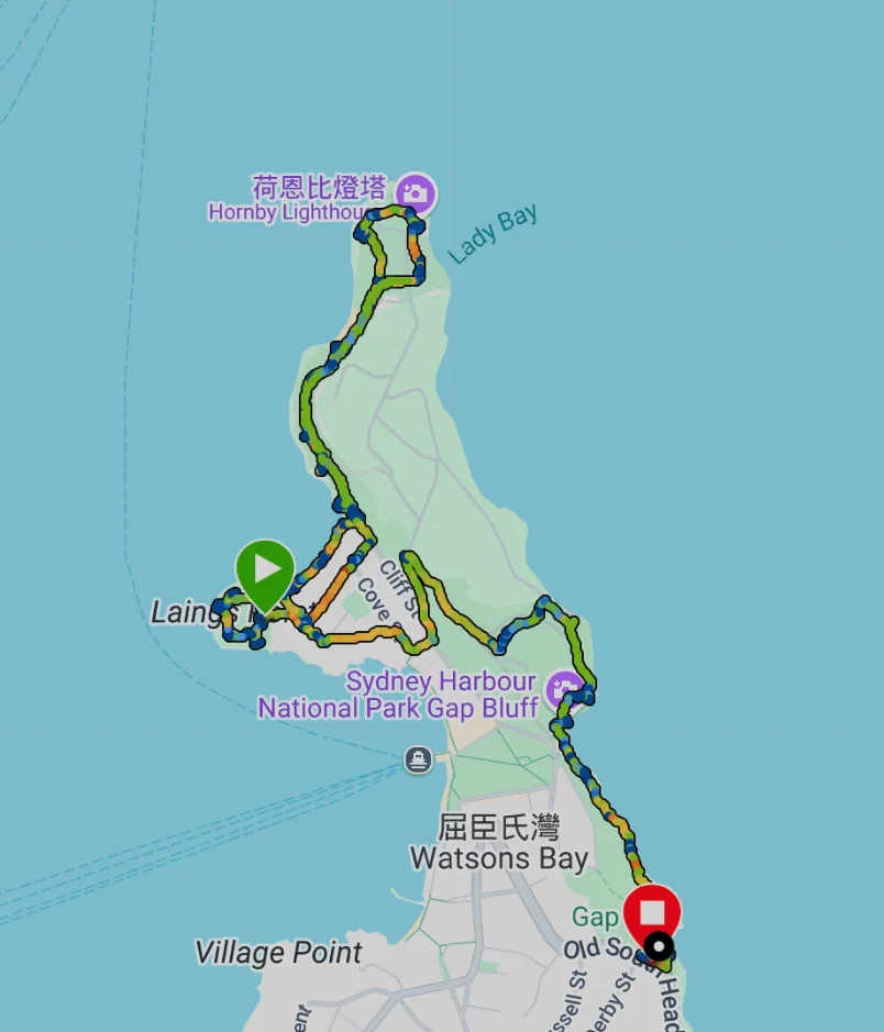 Google Map 上的地標很混亂,除了參考我等等提供的各地點位置,也可以看一下我記錄的離線地圖,但是…前面一小段沒記錄到(屈臣氏灣到 Camp Cove Beach)。
