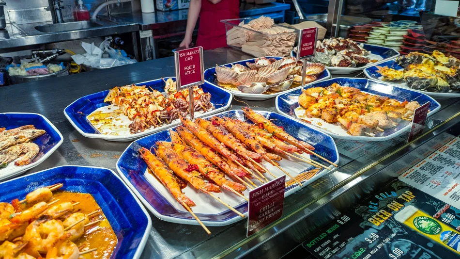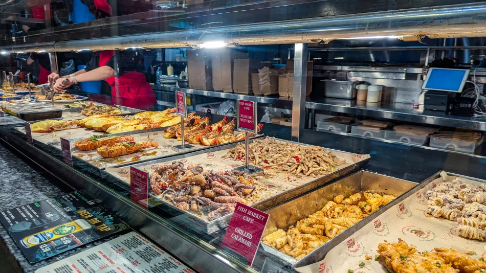 進入魚市場之後最重要的事情當然就是…覓食,強烈建議在中午11:00前過來,用餐尖峰時刻可能會人滿為患。魚市場內部有一些熟食攤位、不用擔心餓肚子,只是價格很不可愛,強烈建議結伴同行,吃東西比較划算。