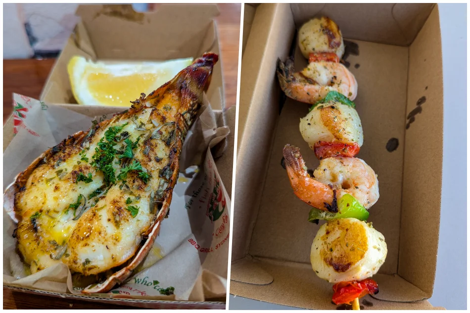 我在這邊吃了干貝串與烤龍蝦,前者非常鮮甜,後者有點老、不太推,總之…就當成旅行的探險吧!強烈建議在室內用餐,想在戶外享用的話務必小心食物搶匪–海鷗,牠們超級煩人,務必要看好自己的食物。