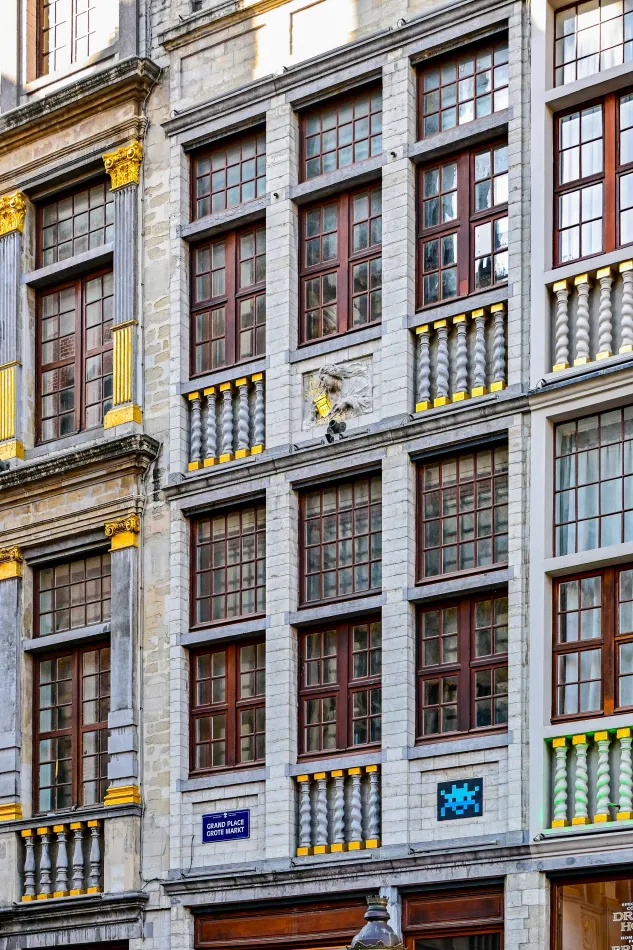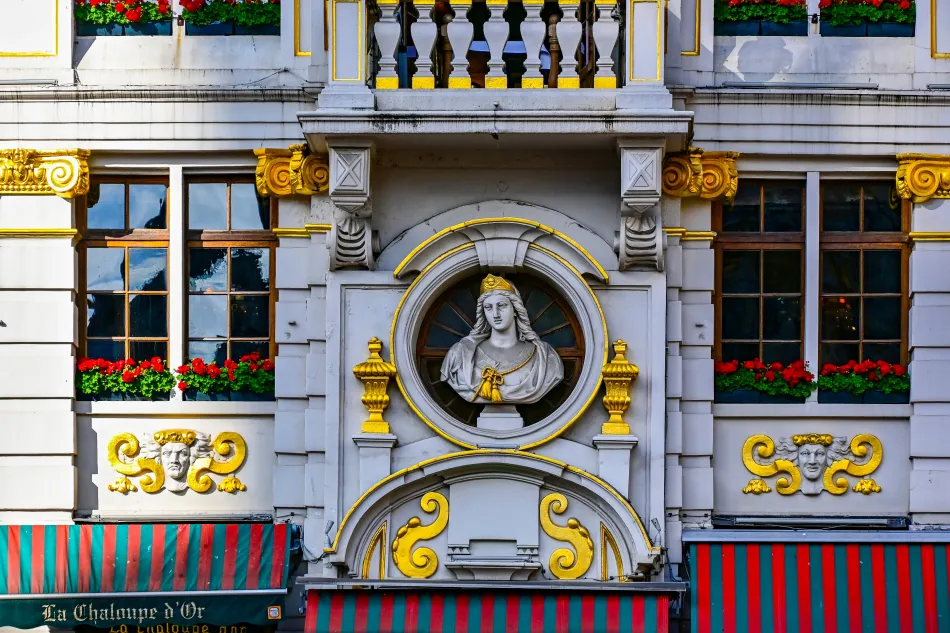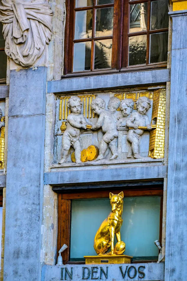 這邊的建築也蠻有趣的,有一棟最上面有獅子雕刻、下方應該是某一位哈布斯堡王朝的君主(他的長下巴是該王朝不斷近親通婚的後遺症),門楣上有短號(cornet),所以稱為短號之家(Le Cornet/”The Cornet”),屬於船夫公會,這一棟的裝飾很特別、值得細看!
