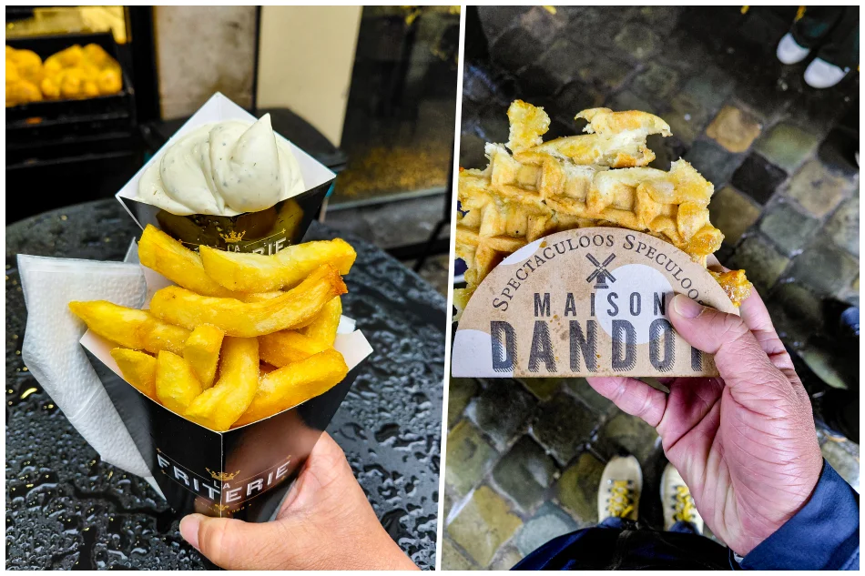 La Friterie 偏軟但不爛又帶點酥脆感,是我很愛的薯條類型,Maison Dandoy 鬆餅酥酥脆脆的、有嚼勁,不是軟爛的那一種,也可以買來吃。導覽時有送一種,我選鬆餅,然後自費買薯條。