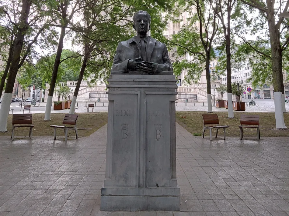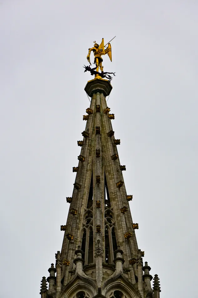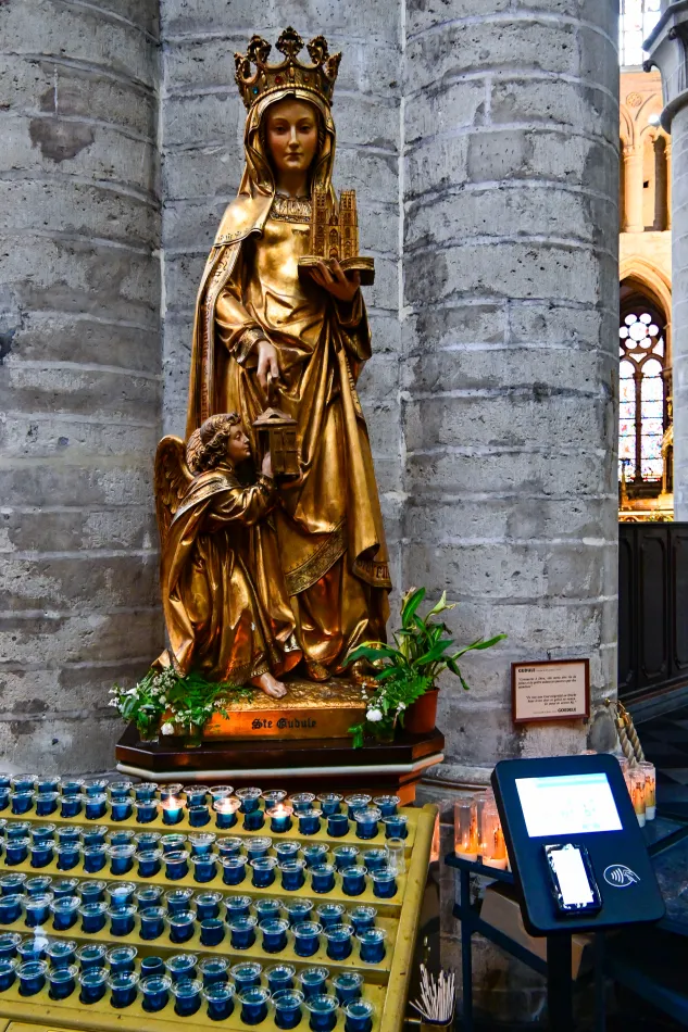 Saint Gudula 約於西元646年出生、712年過世,教堂內有一尊祂的雕像,手持聖彌額爾聖古都勒主教座堂與燈籠。燈籠的緣由是…在祂前去教堂祈禱時惡魔常常會想要吹熄燈籠、讓祂找不到路,這時候祂就會上天求救,然後會有天使協助祂點燃燈籠。總之…這就是基督教常會有的傳奇故事、不用太細究。