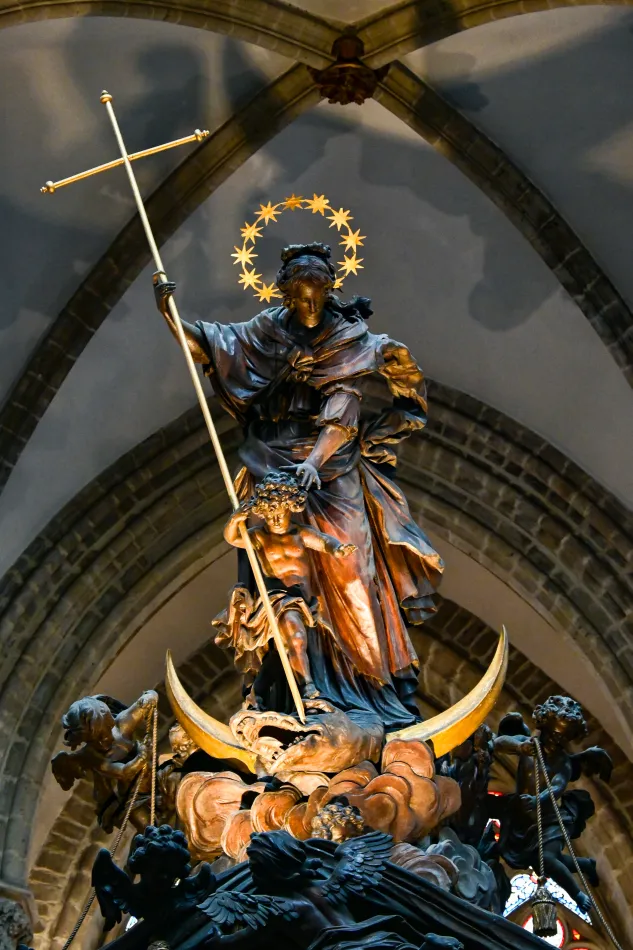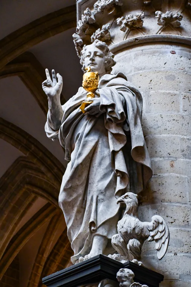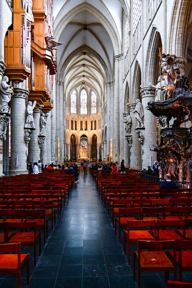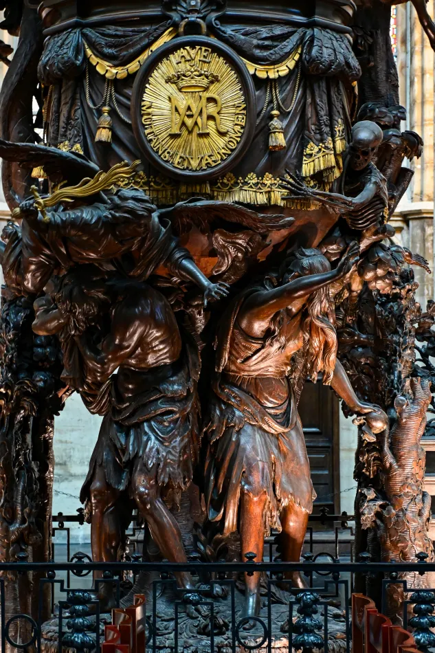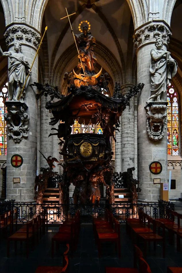 進入教堂後一定不會錯過由橡木製成的佈道講壇,在1699年完成、幾年後由魯汶的教堂移到這邊。最下方生動的雕刻是呈現亞當與夏娃被逐出天堂的故事,上方則代表耶穌與聖母合力戰勝亞當與夏娃釋放出的邪惡。其實…我覺得有點難理解啦!