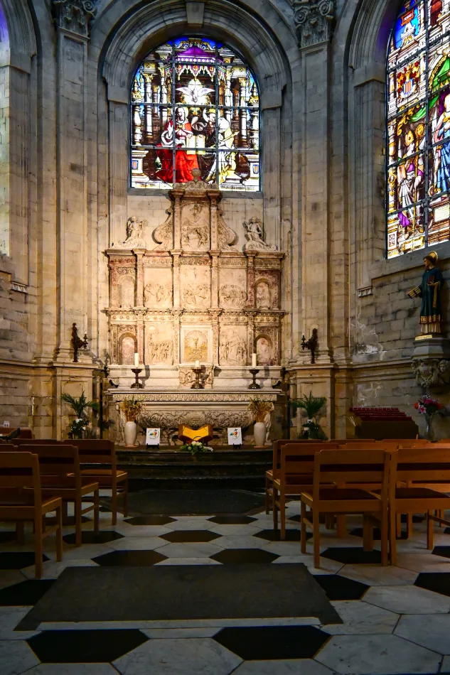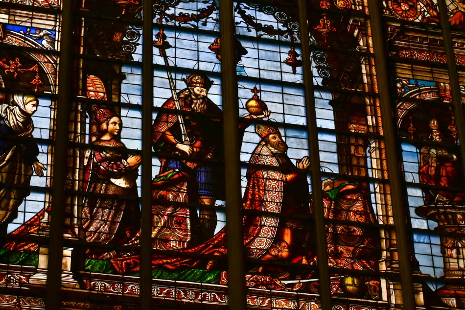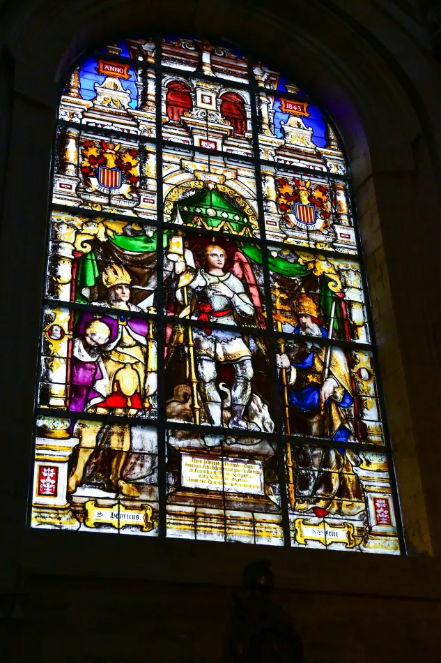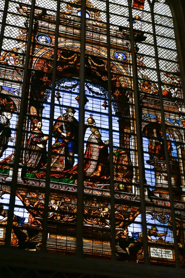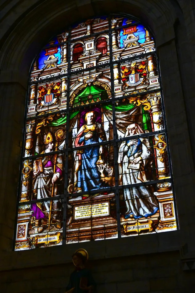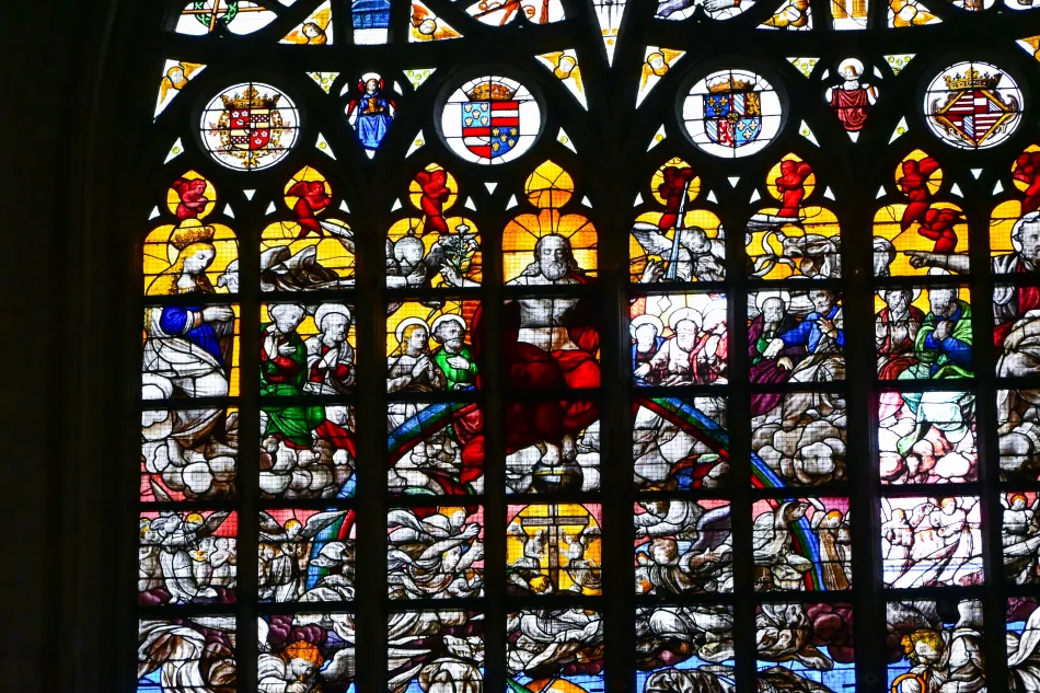 這個教堂重要的彩繪玻璃之一與查理五世有關,兩個跪地的人物是查理五世以及他的老婆:葡萄牙的伊莎貝拉,兩位聖人則是查理五世的守護聖人:查里曼與聖麗莎(Saint Elizabeth of Thuringia)。