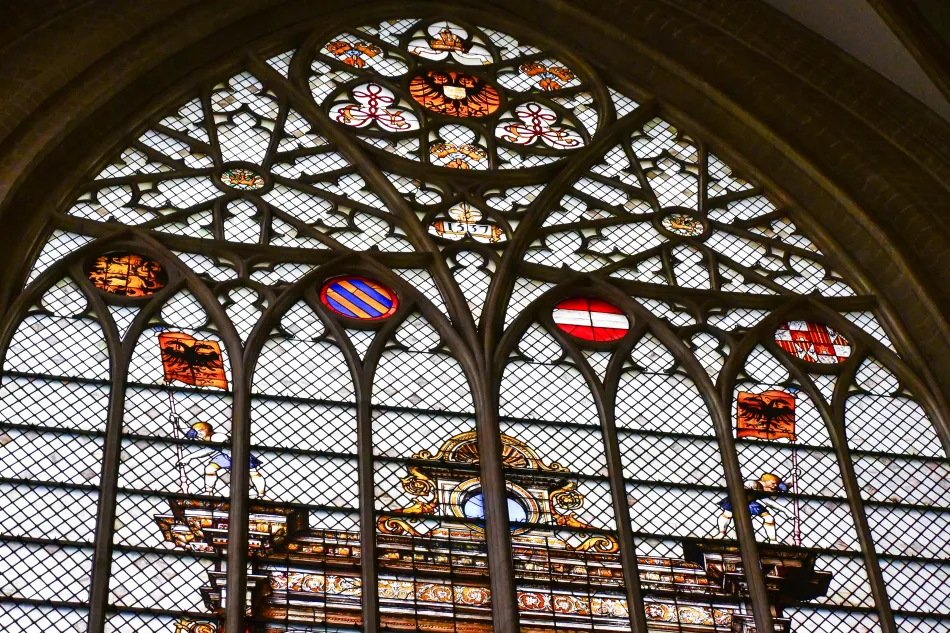 與查理五世的彩繪玻璃遙遙相對的則是匈牙利的瑪麗亞,她是查理五世的妹妹、代理它統治現在的比利時、荷蘭一帶,有興趣的話可以看看導覽內容的介紹(要付費)。