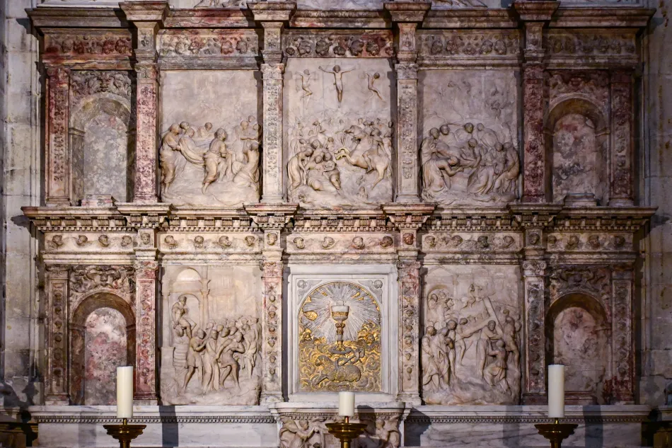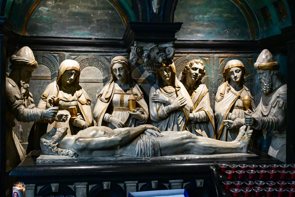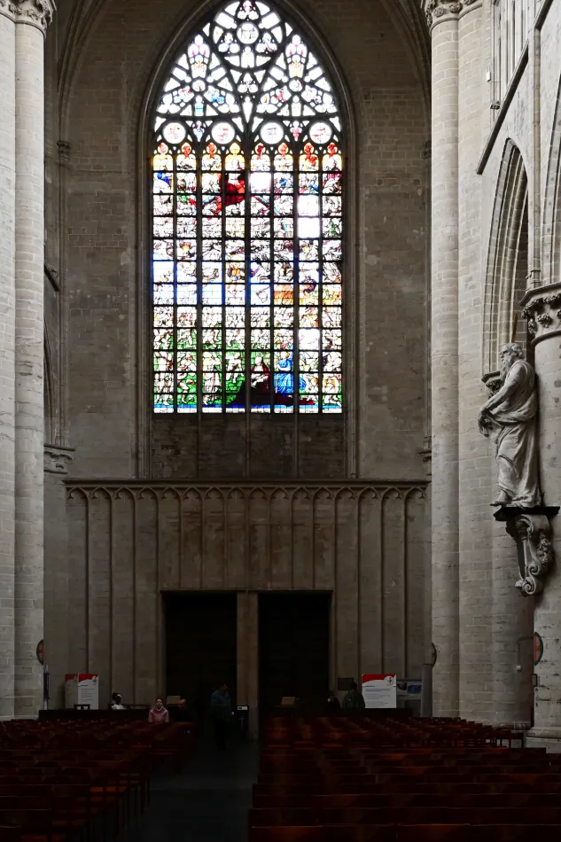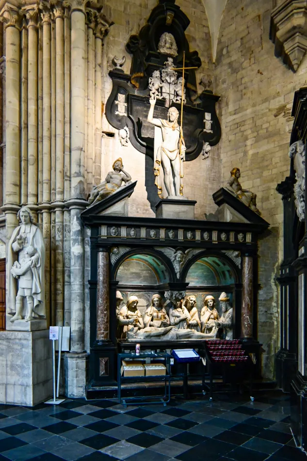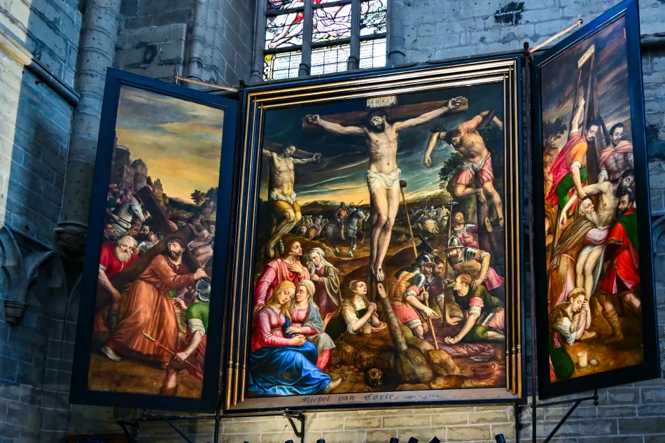 教堂內有幅顯眼的油畫,是查理五世宮廷畫家 Michiel Coxie the Elder 的作品,主題是很常見的耶穌受難,中間那一幅很好認出下方哀傷的聖母以及耶穌正下方的抹大拉的瑪利亞。在教堂其他地方也有耶穌受難、升天的雕刻,有興趣的話可以看一下。