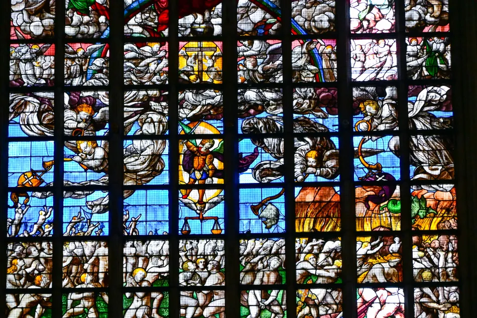 我沒花太多時間在教堂的主祭壇,倒是…仔細看了一下正立面的彩繪玻璃,主題是最後的審判,可以看到最上方的耶穌,再來是天國,最下方則是地獄,在那邊跟惡魔搏鬥的可能是聖米歇爾吧!