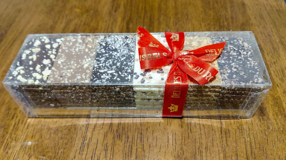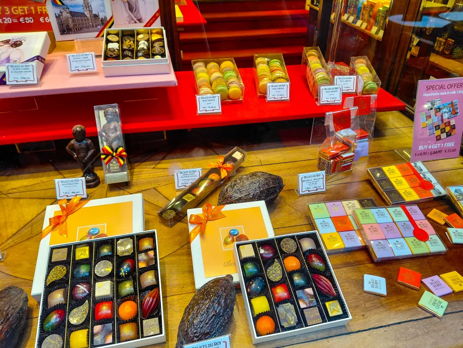 除了拍拍讓人賞心悅目的建築,這邊也有超多比利時巧克力店,例如:Mary、Neuhaus、Leonidas 等等,是採購比利時巧克力的好地方,我除了買 Neuhaus 的果仁糖巧克力(Pralin)1,也買了 Les Délices du Roy 的巧克力片。