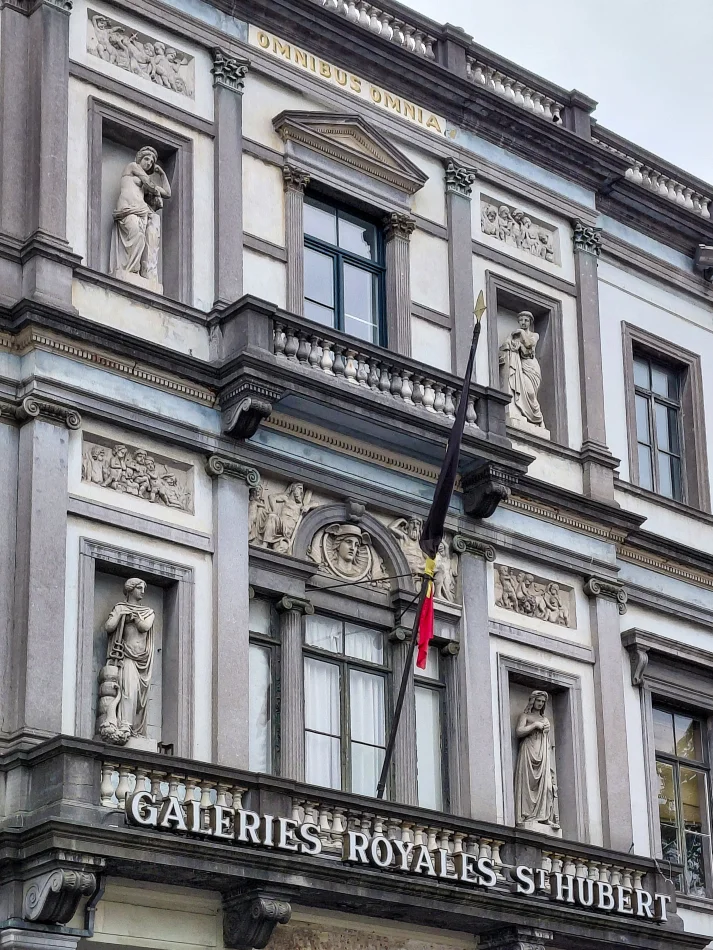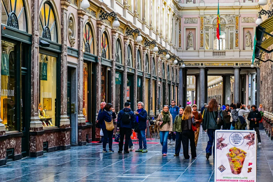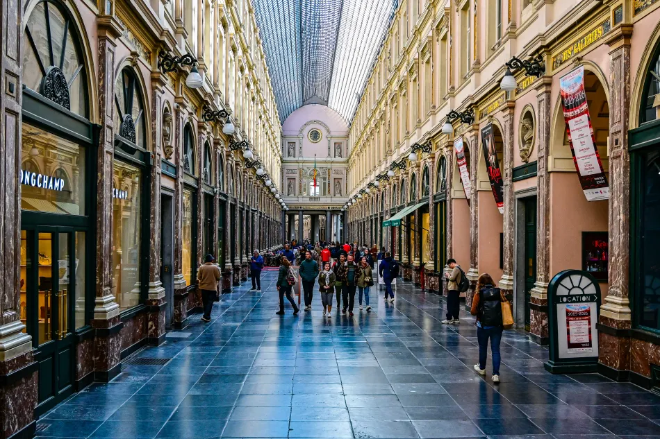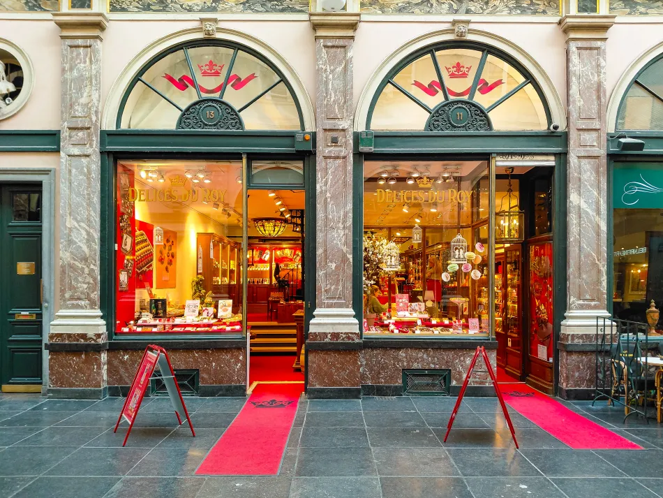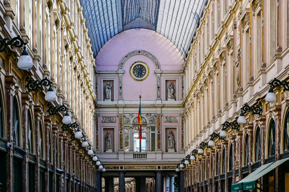 位於大廣場附近的聖休伯特拱廊街(Royal Saint-Hubert Galleries,Google Map 位置圖)是歐洲第一個購物拱廊,策劃者是建築師 Jean-Pierre Cluysenaar、於1847年開幕。
