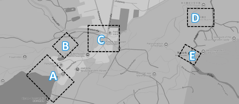 新天鵝堡的遊覽方式很簡單,重點遊覽區域是新天鵝堡、瑪莉安橋跟 Alpsee,建議順序:瑪莉安橋⇒新天鵝堡⇒Alpsee,到新天鵝堡的交通方式後面再介紹。
