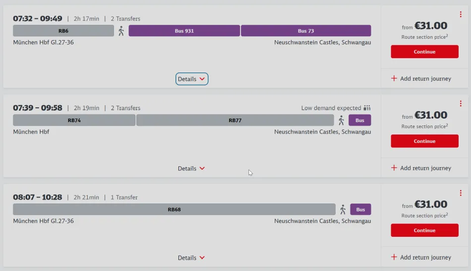 慕尼黑到霍恩施萬高全程可以使用拜楊邦票 Bayern Ticket,但拜楊邦票週一到週五要使用日的09:00之後才能用,週末則是使用日的00:00起就可用了,使用截止時間是使用日隔天的03:00。價格如下: