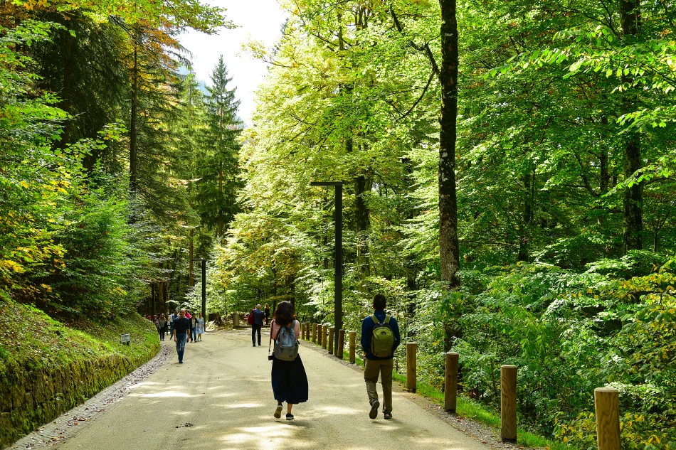 新天鵝堡跟瑪莉安橋都位於山丘上,從遊客中心步行到新天鵝堡約2公里、40分鐘,是緩步上坡、非常好走,路線簡單就不介紹太多了。當然也可以搭乘接駁車或馬車,文末再說明。整體行程建議如下: