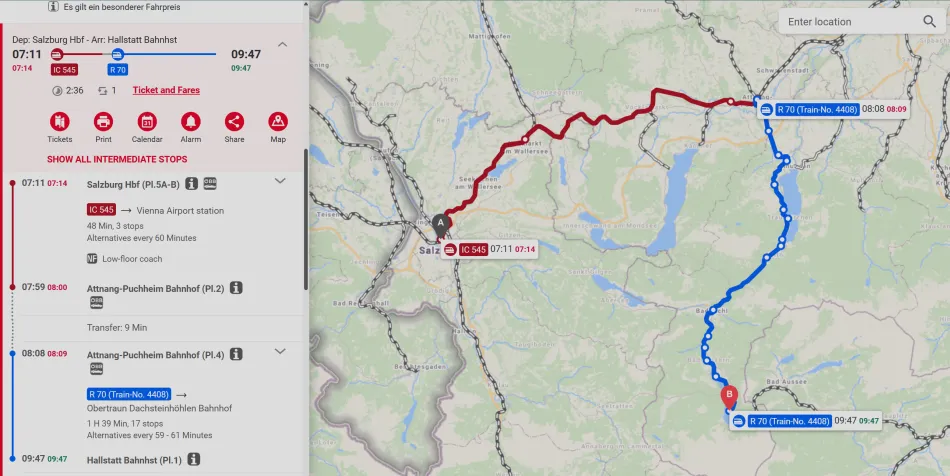 - 全程火車:Salzburg Hbf⇒Hallstatt Bahnhst