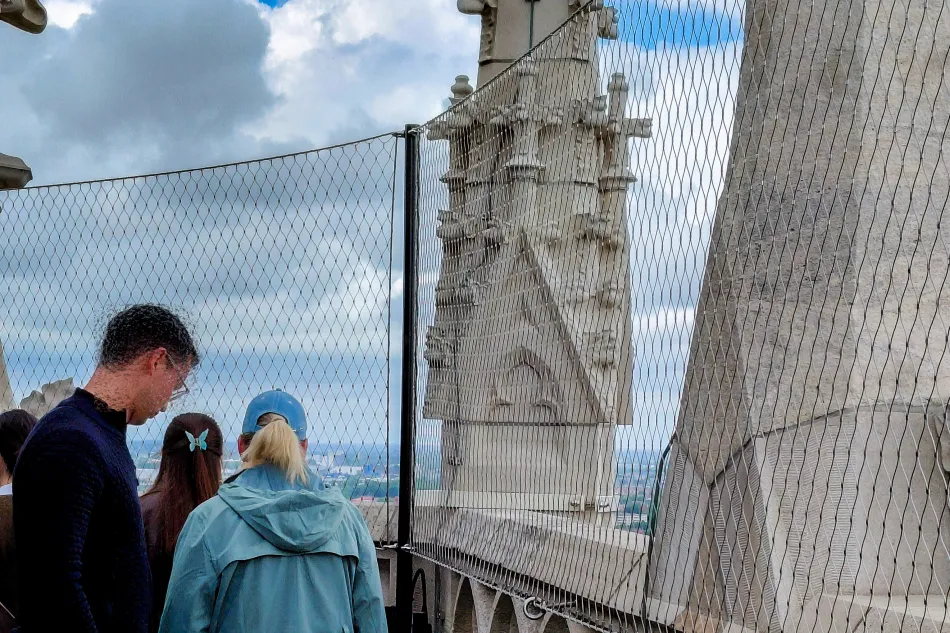 雖然塔樓高度超過100公尺、需要爬465階到最上方的觀景台,但途中會休息多次,第一個休息地點是過去塔樓管理人員的生活區域,那邊有陳列一些以前塔樓的斷垣殘片以及古老的圖像,可以發現以前確實有跟主教座堂連結。