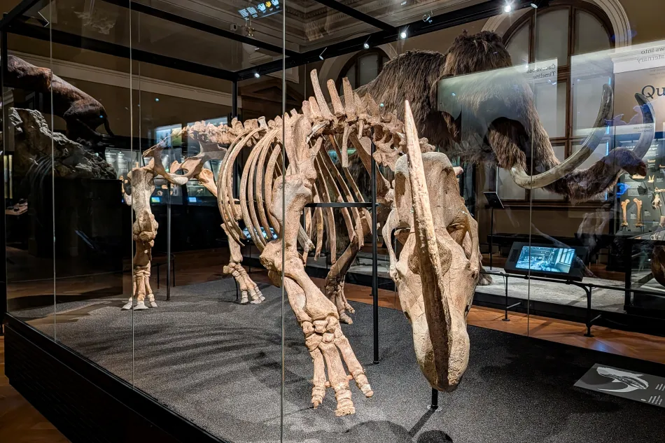早已滅絕的披毛犀是生活在歐亞大陸北部的犀牛,因為有長長的皮毛也稱為長毛犀,牠的角很脆弱,所以博物館化石的角是另外製作的。