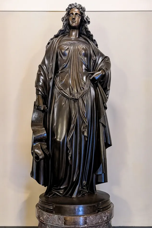 捷克國家博物館的特色之一就是陳列超多捷克名人雕像,除了等等介紹的先賢祠,地面層入口附近以及二樓走廊四周也有不少,除非很理解捷克歷史、不然應該認不出來,雕像下方有標示人名就是了。這些雕像中我印象最深刻的是傳說中捷克人的祖先:莉布絲公主(Libuše),在舊城區的查理街上可以看到她的鵝黃色浮雕。