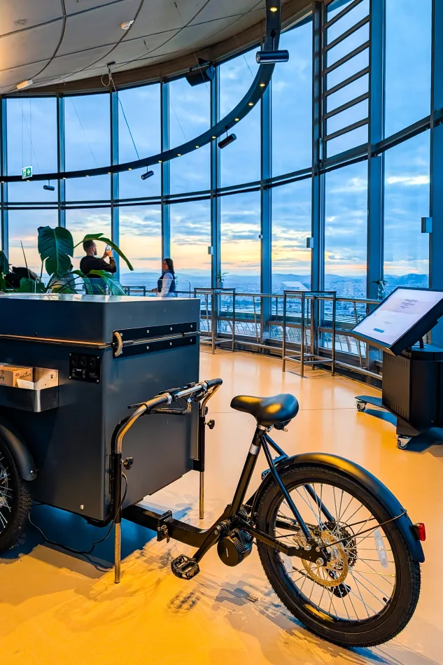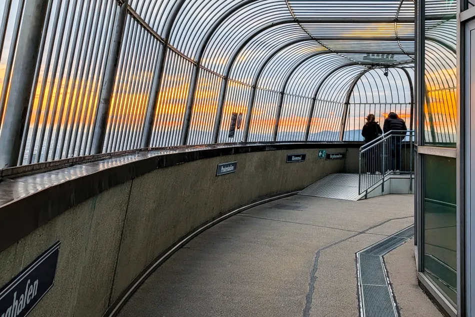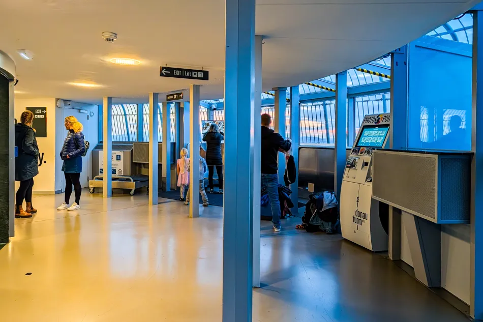 進入多瑙河塔後,順著動線就可以搭乘電梯到高約150公尺的觀景台,最下層的觀景台內部平凡無奇、沒啥好看的,可以走到戶外露天區域眺望南邊的維也納市區天際線。即使夏天造訪,還是建議攜帶薄外套,風大時會超冷。