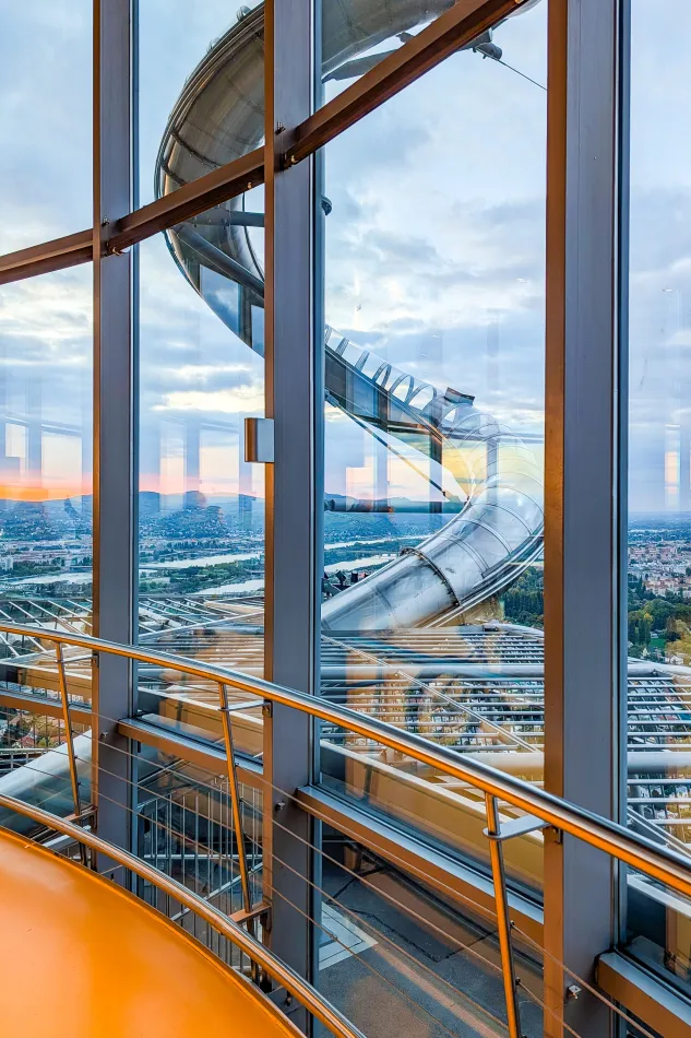 位於維也納市區北邊多瑙公園(Donaupark)的多瑙河塔(Donauturm)雖然不是名聞遐邇的高塔,卻也是維也納的熱門景點,而且有設置溜滑梯。它不在維也納核心城區,但由市中心過來還蠻方便的,只是要轉搭公車。