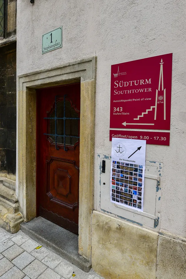 高約136公尺的南塔又被稱為“Steffl”,是“Stephen”的縮寫,想上去的話只能走343階的樓梯,入口在教堂外圍南側。南塔的歷史可以追溯到現行大教堂建築主體的修建時期,也是在魯道夫四世動工、於1433年完工,當時高約137公尺,然後在19世紀跟第二次大戰結束後都經歷大幅度的整修。