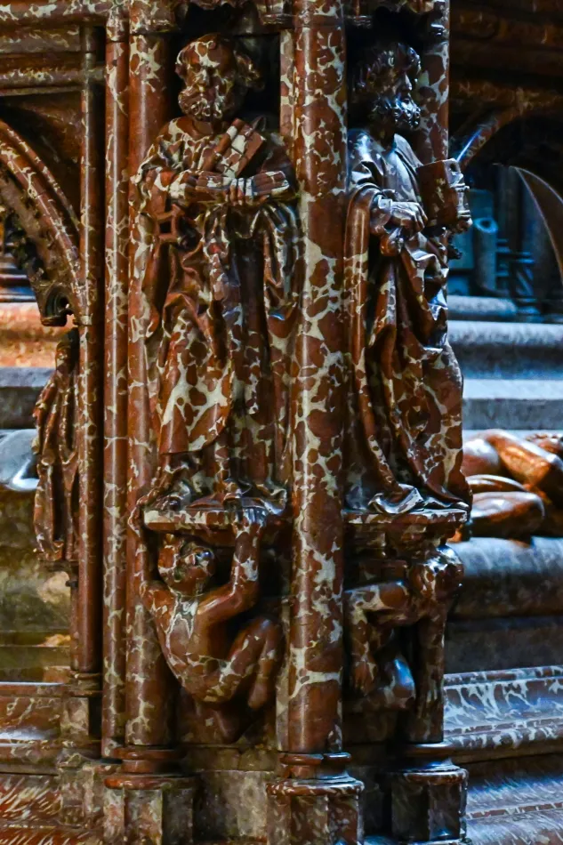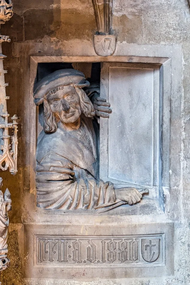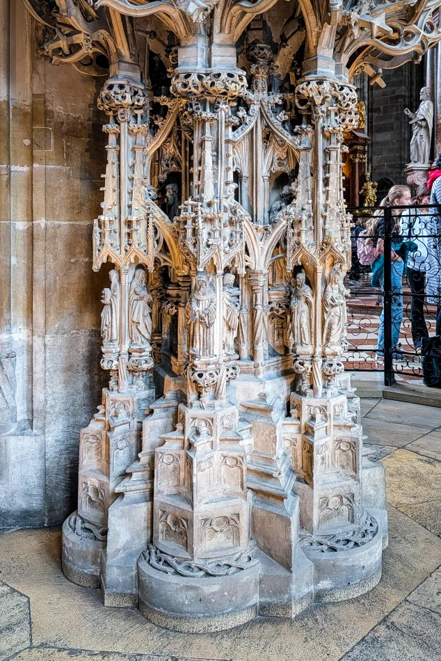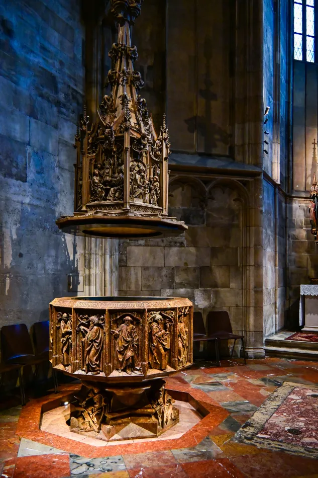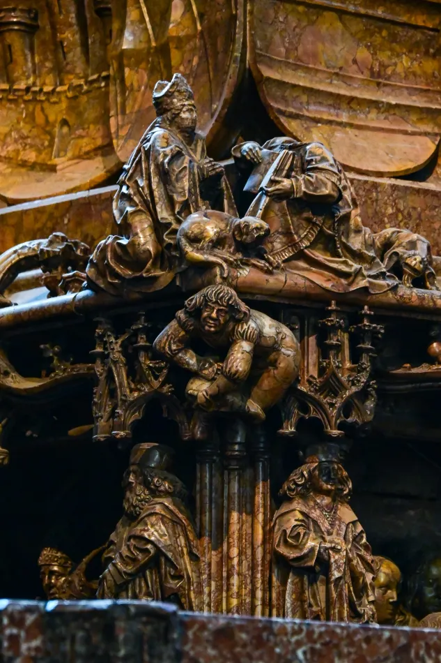 最後一個重點是大教堂佈道講壇,是16世紀初前後的哥德樣式建築,以螺旋狀的方式升上,附近有一個很奇妙的人物雕刻,那是設計這個講壇的設計師。講壇的設計有非常多宗教元素,例如六個支柱搭配一個主要柱子,代表七天,柱子底部有使徒雕刻,上方則有四位教宗。參觀完這區域之後就可以準備出去了!