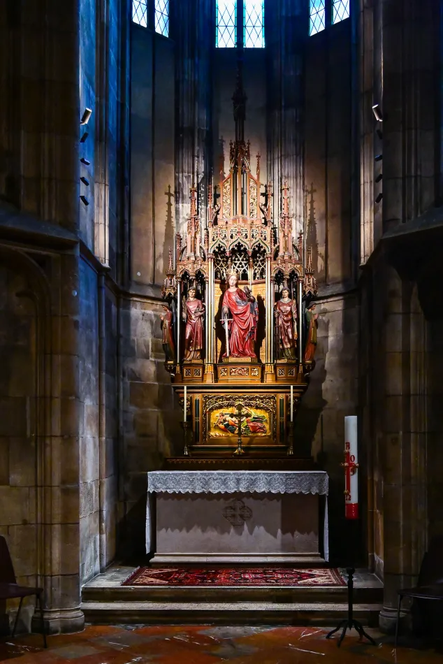 主祭壇旁邊的維也納新城祭壇是15世紀的哥德藝術傑作,打開的時候主題是聖母、關閉的時候則是耶穌受難,主祭壇受損時也曾經充當主祭壇。旁邊的棺木是魯道夫四世的衣冠塚,他被葬於主祭壇下方的地下墓穴,目前的聖史蒂芬大教堂就是在他統治時奠定基礎。