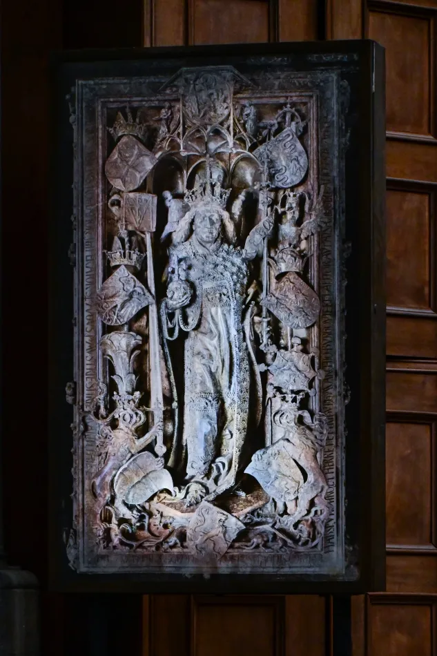 他的棺木以大理石製成、在他過世20年後才完成,棺木四周可以細細欣賞,導覽機有說明,最顯眼的是他過世時各領地的紋章,也可以看看棺木四周的小小人物雕刻。