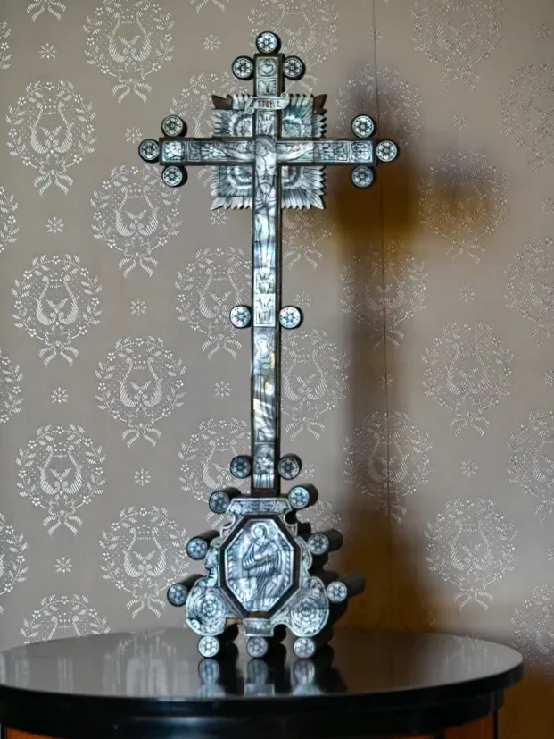 通過上述房間之後就會來到另一側的走道,重點依然是旁邊的眾多房間,大多有擺放珍貴文物,例如來自墨西哥的十字架、有埃及風格床角的床。