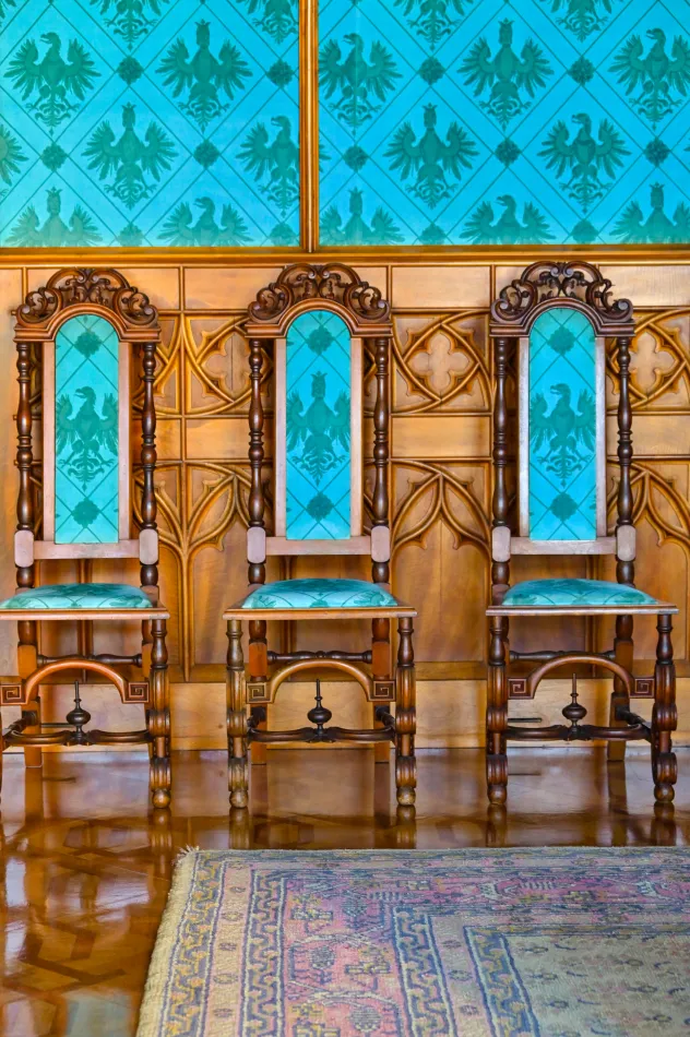最後一個參觀區域是藍色音樂大廳(Blue Music Hall),也是參觀區域中最大的空間,以前是舉辦宴會的舞廳,陳列許多重要文物,例如:沙皇贈送的花瓶、來自威尼斯的玻璃、由德國大理石製作的壁爐等等。這是最後一站,拍夠之後順著動線由城堡後面的出口離開吧!
