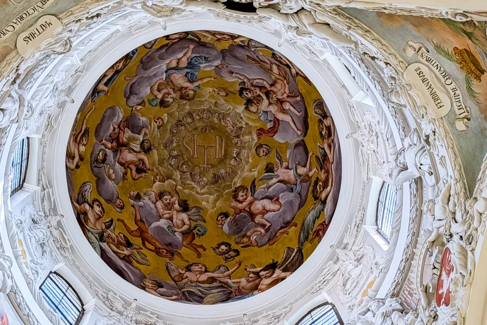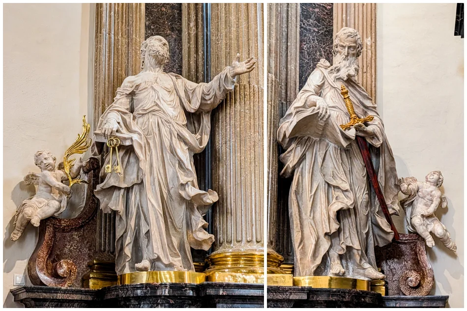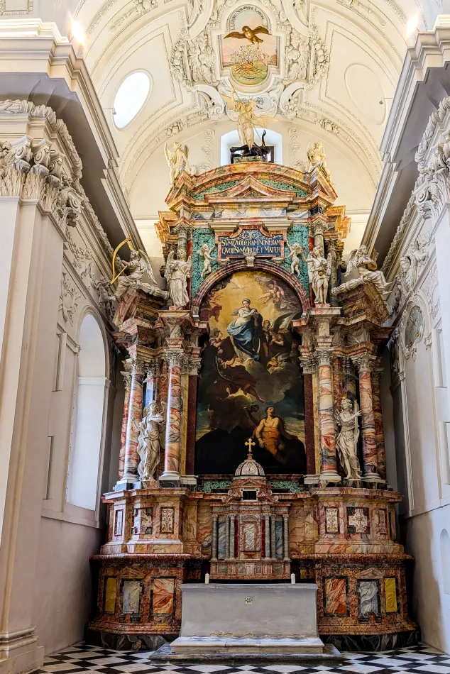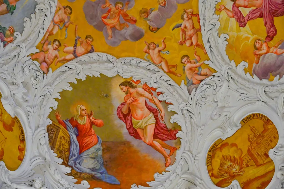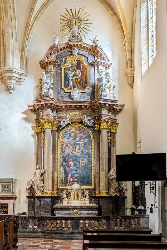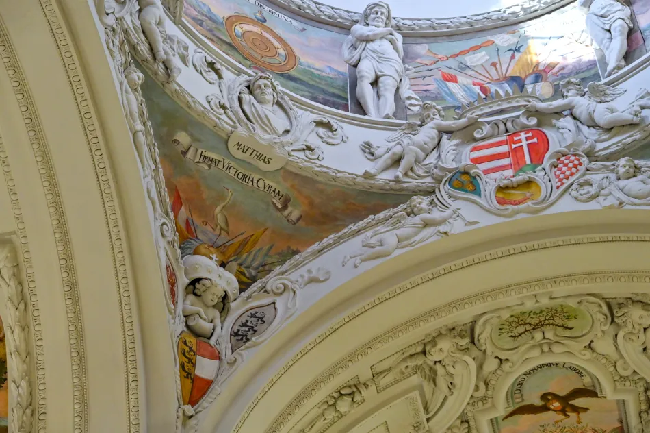 這邊的天頂壁畫可以欣賞、頭會很痠就是了,主題是1683年的維也納圍城戰,另一個祭壇則是紀念聖母,最上面的雕刻可能是加百列與撒旦吧!