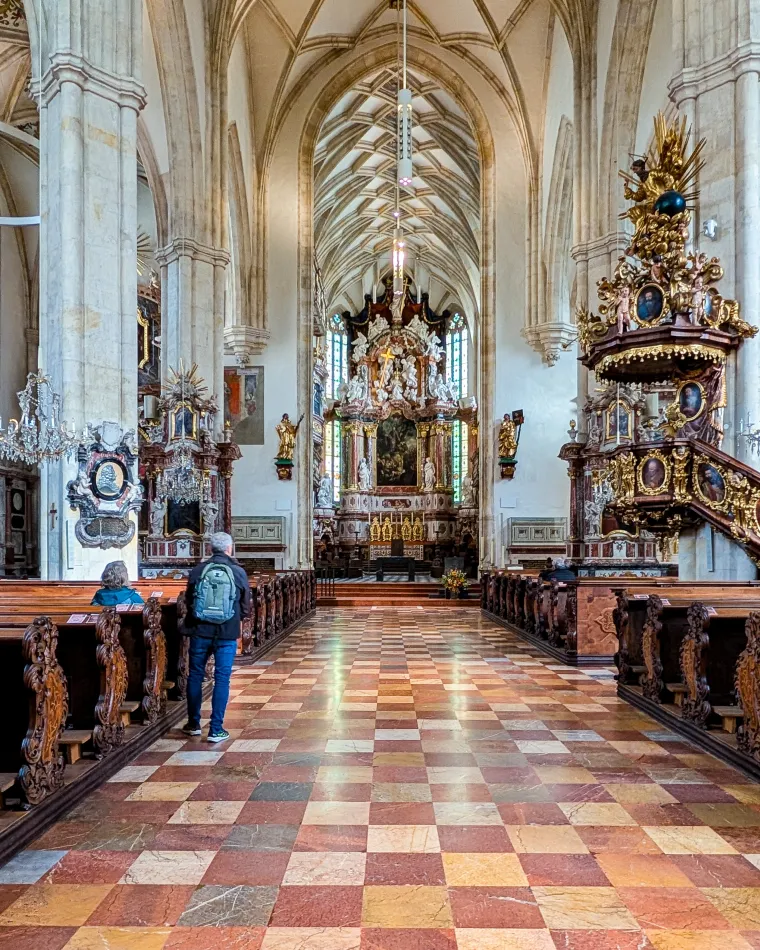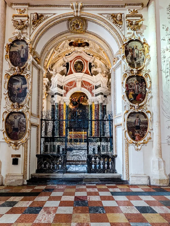 聖基爾斯主教座堂的現行建築可以追溯到15世紀,雖然歷史悠久…其實就是一個歐洲常見的巴洛克樣式教堂,有經過的話可以進去看看,就是欣賞一些祭壇、油畫之類的文物,沒有太多文字介紹。裡面有兩個超顯眼的聖物匣,那是由象牙製作的,於17世紀起在教堂陳列,歷史當然更為悠久。
