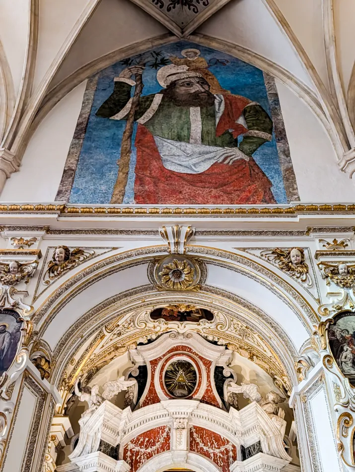另一位顯眼的角色是聖凱瑟琳(Catherine of Alexandria),這邊的主祭壇就是為了紀念這位聖人。最下方是她從容就義的模樣,中間的雕刻當然就是她了,最上方則是她榮升天國、與聖母相會,仔細觀察外面正立面上方,也可以看到她被斬首前的模樣。