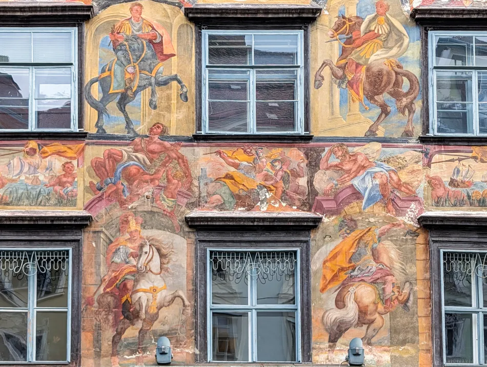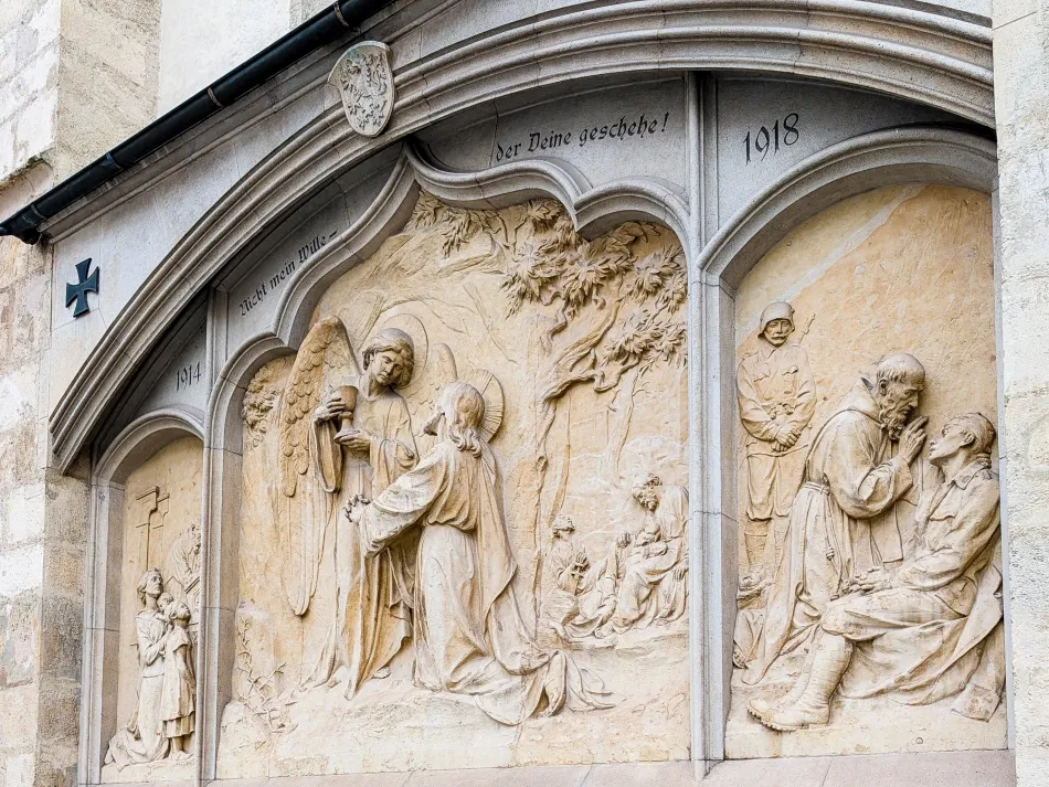 格拉茲的大教堂(Grazer Dom)–聖基爾斯主教座堂(Domkirche zum Heiligen Ägydius in Graz)就在斐迪南二世皇帝陵墓旁邊,教堂旁邊有超顯眼的濕壁畫,那是為了紀念格拉茲在15世紀遭遇的慘況:瘟疫、戰爭和蝗災,教堂另一面的雕刻則是緬懷一戰犧牲的軍人與百姓。